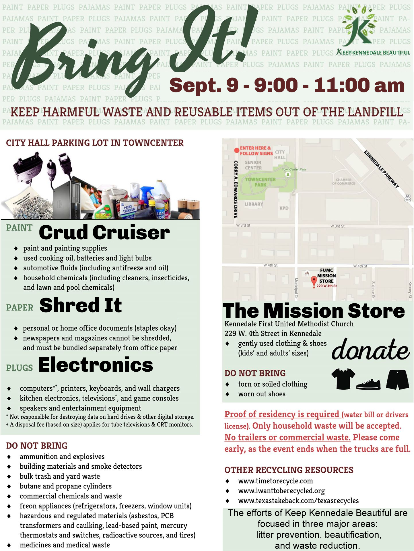 NOTE: Proof of Kennedale residency is required via a current water bill or driver's license. Only household residential items will be accepted. No commercial waste or trailers are allowed. The event ends when containers are full.